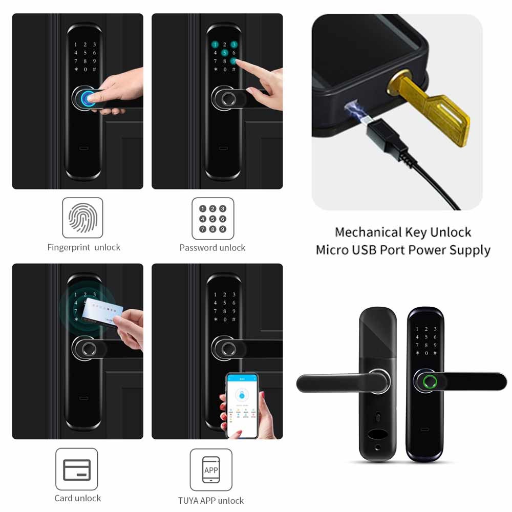 Posiada wygodny system zarządzania i 6 sposobów odblokowania: odblokowanie odciskiem palca, odblokowanie BLE APP, zdalne odblokowanie WiFi,Odblokowanie hasła/kodu PIN, odblokowanie kartyi klucze mechaniczne Odblokuj. Zaspokoi wszystkie Twoje potrzeby dotyczące inteligentnego zamka. Dzięki zaawansowanemu zarządzaniu aplikacjami, przez Wi-Fi lub BLE, aby podłączyć inteligentną blokadę do smartfona i możesz zarządzać inteligentnym zamkiem drzwi w dowolnym miejscu i czasie.
